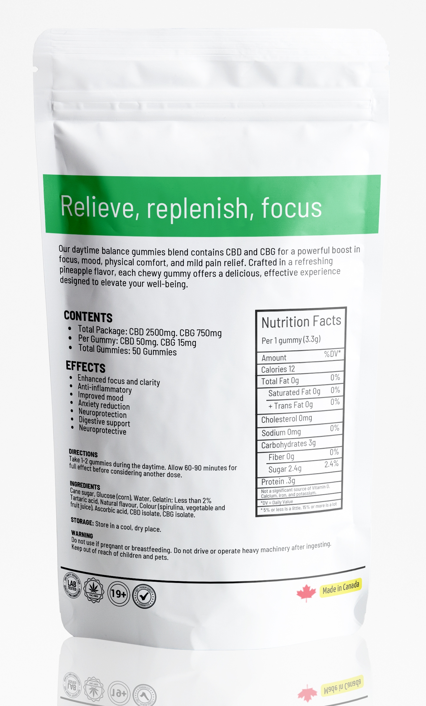 The Daytime Balance Gummies combine CBD (Cannabidiol) and CBG (Cannabigerol) to provide a perfect blend of mental clarity, relaxation, and natural energy. Designed for daytime use, these gummies enhance focus, reduce stress, and support overall well-being without drowsiness. Whether you’re tackling a busy workday, studying, or just need an extra boost, these gummies offer calm, balanced energy to help you stay productive.