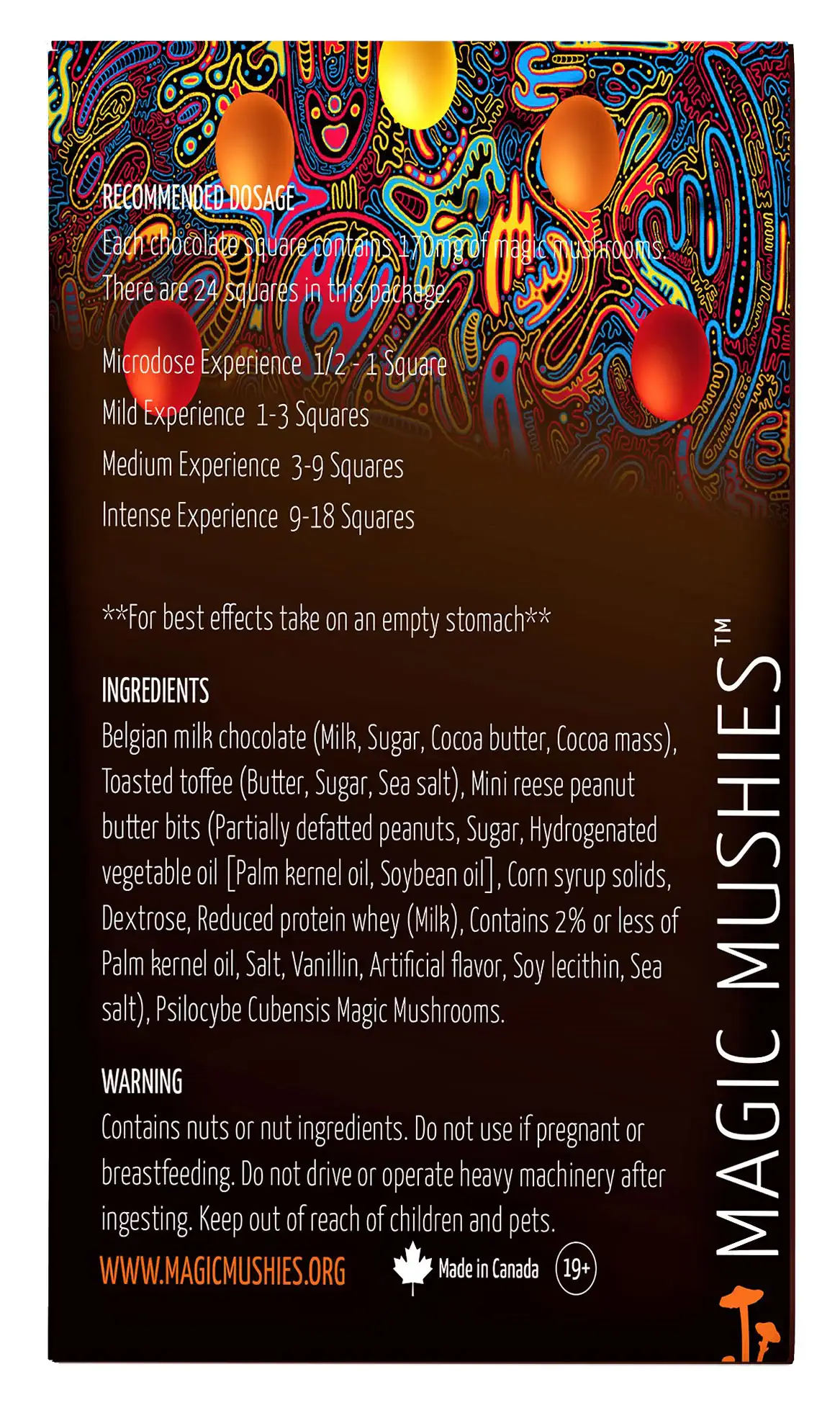 Our master chocolatiers and in-house chefs combined with our organically grown, very potent magic mushrooms make the perfect chocolate bar. We use only the best-grown magic mushrooms and the highest-grade Belgian milk chocolate, toasted toffee, and Reese’s peanut butter bits to create this delicious and powerful psychedelic Magic Mushroom chocolate bar.