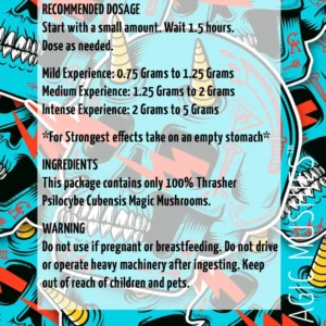 Thrasher Magic Mushrooms are incredibly powerful. They will leave you Thrashed. Expect intense auditory and visual Hallucinations and a wild ride of intense closed-eye visuals and deep spiritual introspection. Fall deep in to the rabbit hole and experience oneness with the universe!